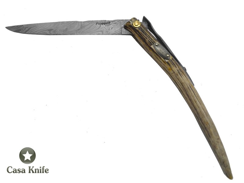 Canivete Gigante para colecionador forjado em aço damasco 15N20 - 1095 - 58 HCR -288 camadas pelo famoso cuteleiro Gaúcho Adelar Filippon. Empunhadura em chifre de cervo. Trava na parte superior do canivete. Contém medalhão em aço damasco para gravação do nome. Acompanha bainha em couro marron.