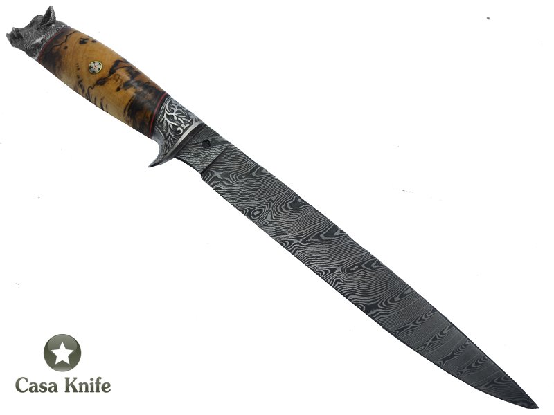 Adelar Filippon faca para churrasco para colecionador fojado em aço damasco torcido 15N20 / 1095 / 58 HCR / 120 camadas. Empunhadura em Spalted Platano, 36 cm