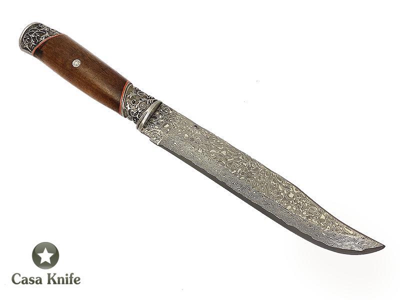 Adelar Filippon faca para colecionador forjado em aço damasco 15N20 / 1095 / 58 HCR / 288 camadas. Empunhadura em Radica Imbuia, 31 cm