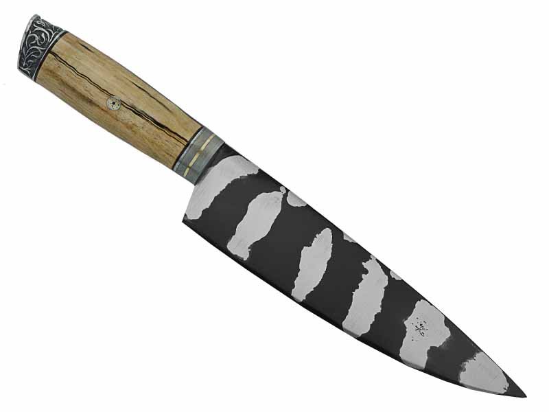 Adelar Filippon faca para colecionador forjado em aço Go May padrão zebra. Empunhadura em Spalted de plátano estabilizado, 35 cm