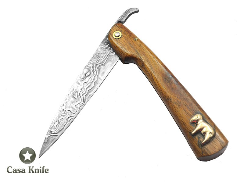 Canivete Friction Folder para colecionador em aço damasco. Empunhadura em Madeira de Cedro do Pará, 21 cm
