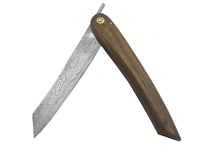 Canivete Friction Folder para colecionador forjado em aço damasco. Empunhadura em Madeira Teca, 21 cm