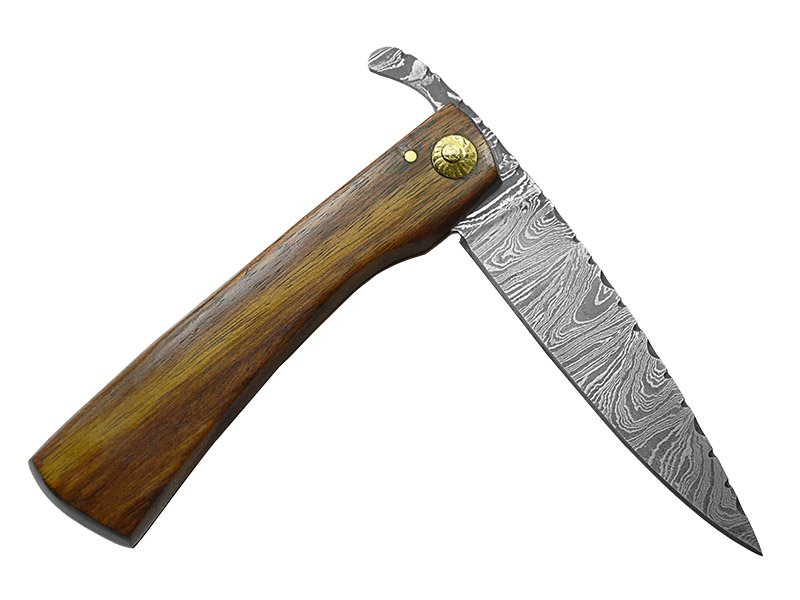 Canivete Friction Folder para colecionador forjado em aço damasco. Empunhadura em madeira teca, 21 cm