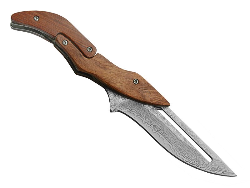 Canivete italiano para colecionador em aço inox com lâmina de bloqueio. Empunhadura em sândalo. Linda gravação em lazer na lâmina imitando aço damasco. Contém bainha em couro natural feita à mão.