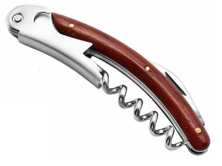 Canivete para colecionador com 2 funções: 1- lâmina pequena, 2- saca rolhas. Empunhadura em madeira. Contém pinos em bronze.
