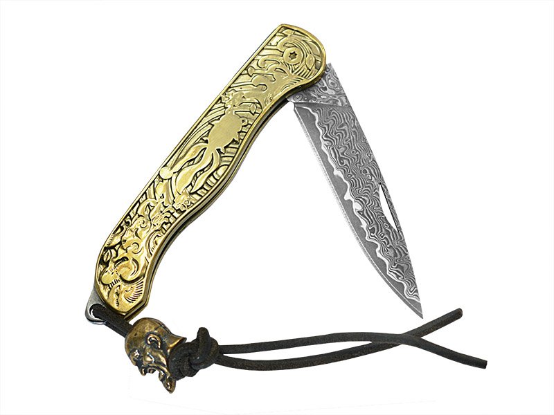 Canivete para colecionador em aço damasco. Empunhadura em bronze. Contém atilho com adorno em latão. Acompanha bainha em couro natural feita à mão.