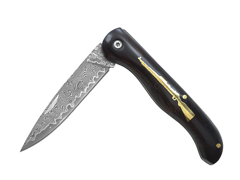 Canivete para colecionador em aço damasco 200 camadas. Empunhadura em ébano africano, pinos e detalhes em bronze. Acompanha bainha em couro natural feita à mão.
