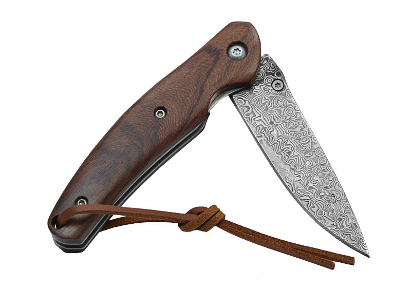 Canivete para colecionador com lâmina forjada em aço damasco. Empunhadura em sândalo vermelho, pinos em inox. Contém trava linerlook. Furo para atilho com lindo atilho em couro. Acompanha bainha em couro natural feita à mão.