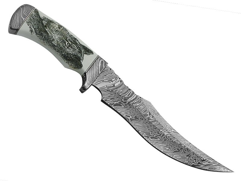 Faca bowie para colecionador em aço damasco 15N20/1095 288 camadas, com alto padrão de tratamento térmico de 58HCR. Empunhadura em osso de búfalo tem uma belíssima escultura de uma leoa com espaçadores em aço inox e fibra. Contém bainha em couro natural feita à mão.