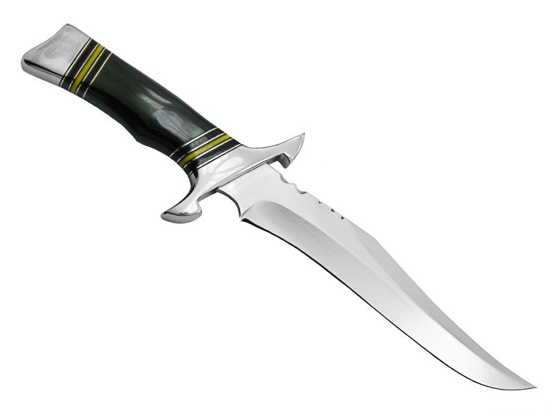 Esta faca bowie é um exemplo extraordinário do fino artesanato do cuteleiro. Esta peça une resistência, desempenho e um equilíbrio extraordinário deste projeto. Fabricada em aço D2 com 62HCR de dureza propiciando uma durabilidade incrível. Empunhadura em osso de búfalo com espaçadores em aço e celeron. Guarda e pomo também em aço Inox . Bainha em couro natural feita à mão completa o conjunto com elegância e praticidade.