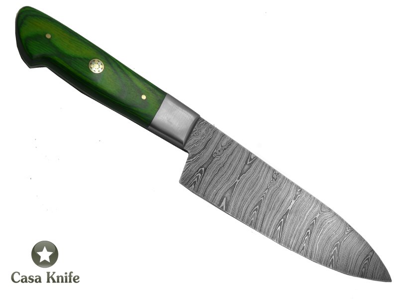 Faca Cheff para colecionador forjado em aço damasco 15N20 / 1095 / 55HCR / 200 camadas . com empunhadura em Pakawood. Guarda em aço inox. Contém pinos e mosaico em bronze.