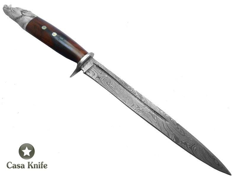 Faca Javalizeira para colecionador forjada em aço damasco 15N20 - 1095 - 58 HCR - 200 camadas. Empunhadura em Jacaranda Bahia com Resina e pomo em chifre de cervo esculpido a mão com cabeça de Javali. Contém guarda e mosaico em aço inox. Acompanha bainha de couro natural feita a mão.