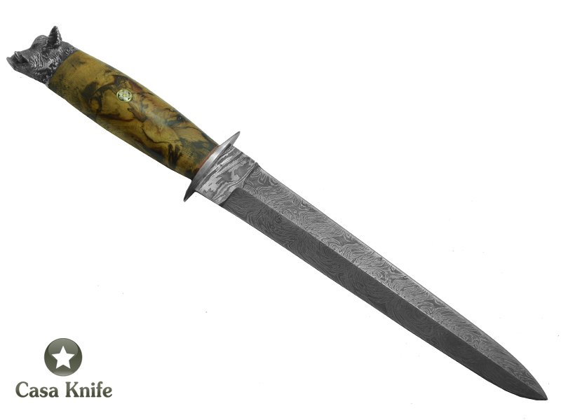 Faca Javalizeira para colecionador forjado em aço Damasco 15N20 - 1095 - 58 HCR - 288 camadas. Empunhadura em Spalted Platano, 35cm