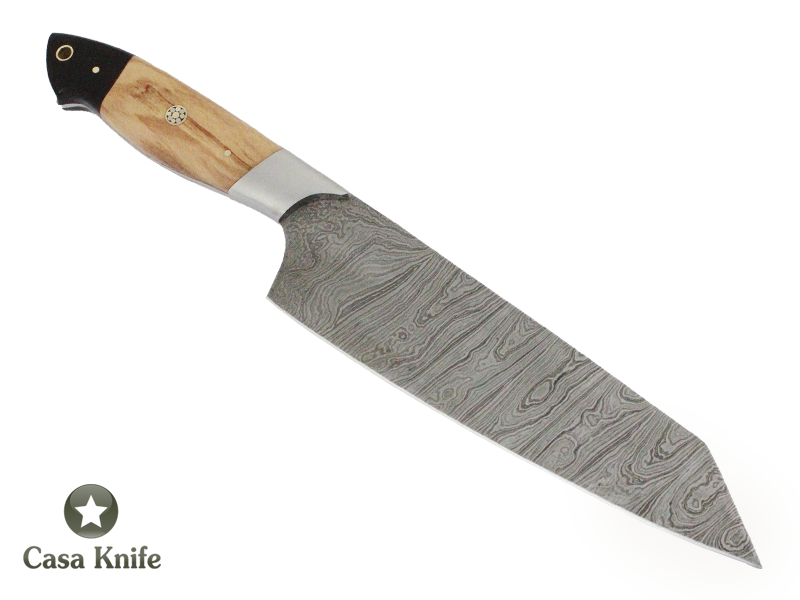 Faca Master Cheff para colecionador forjada em aço damasco 15N20 / 1095 / 58 HCR / 352 camadas, com Empunhadura em Madeira de Oliveira estabilizada e Chifre de Boi. Pinos em mosaico em bronze. Guarda em aço inox.