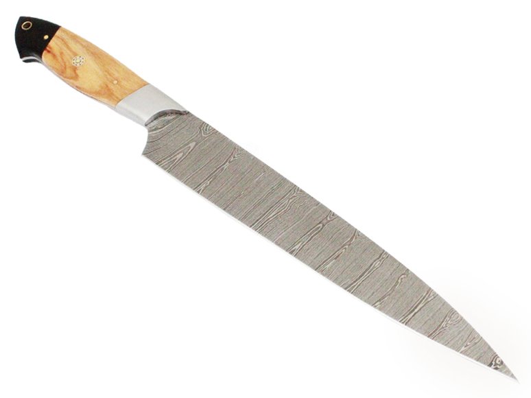 Faca Master Cheff para colecionador forjada em aço damasco 15N20 / 1095 / 58 HCR / 352 camadas, com Empunhadura em Madeira de Oliveira estabilizada e Chifre de Boi. Pinos em mosaico em bronze. Guarda em aço inox.