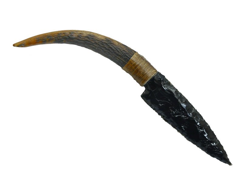 Magnifica faca para colecionador com lâmina em Obsidiana negra. Empunhadura em chifre de cervo. Acompanha bainha em couro natural.