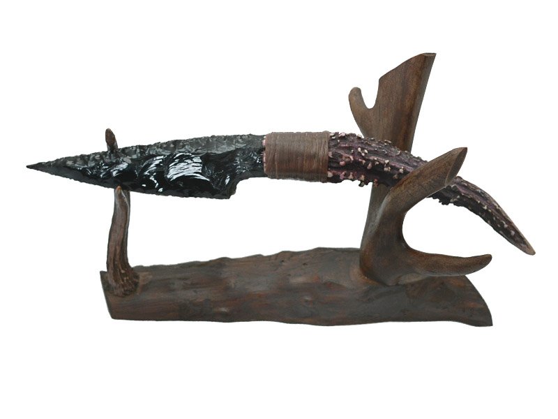 Magnifica faca para colecionador com lâmina em Obsidiana negra. Empunhadura em chifre de cervo e resina. Contém um lindo expositor em madeira.