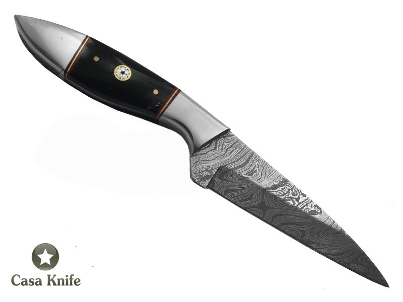 Faca Skinner para colecionador forjado em aço damasco. Empunhadura em chifre de Bufalo, 23 cm
