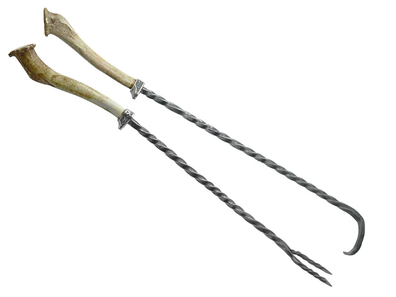 Kit parrilha composto de garfo e virador de carne artesanal forjado em aço 1070. Empunhadura chifre de cervo sambar com roseta guarda em aço inox.