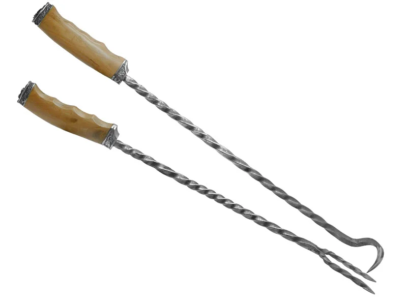 Kit parrilha artesanal composto de garfo e virador de carne, forjado em aço 1070. Empunhadura em madeira de jabuticaba, guarda e pomo em aço inox.