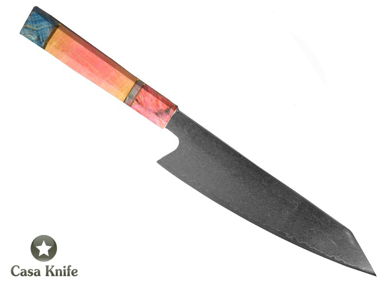 Magnifica faca Santoku para colecionador forjada em aço damasco VG10 com 67 camadas. Empunhadura em Elder Burl estabilizado, com espaçadores em bronze.