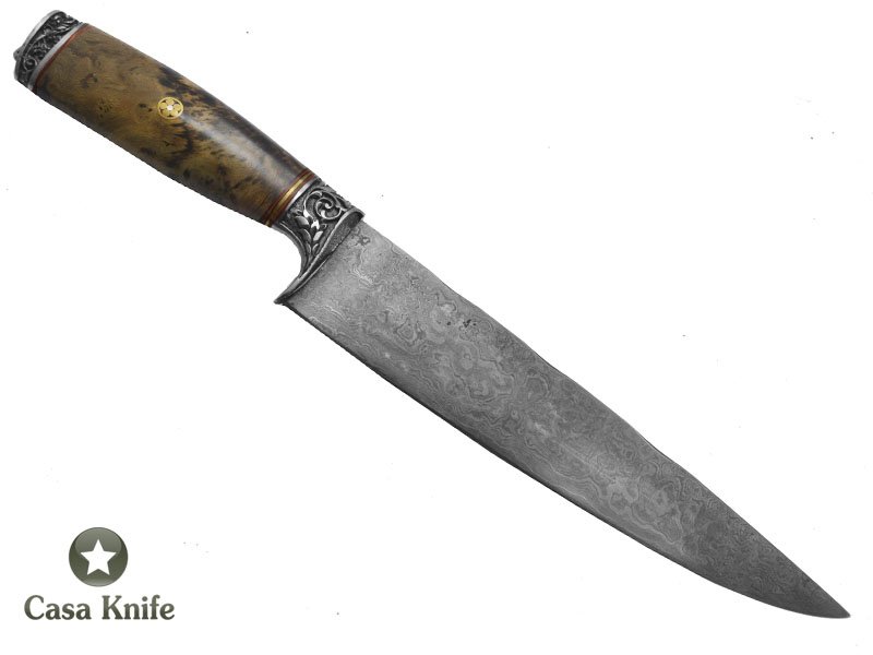 Monte Cristo Faca Cheff para colecionador forjado em aço damasco, empunhadura em Spalted Plantano estabilizado, 33 cm