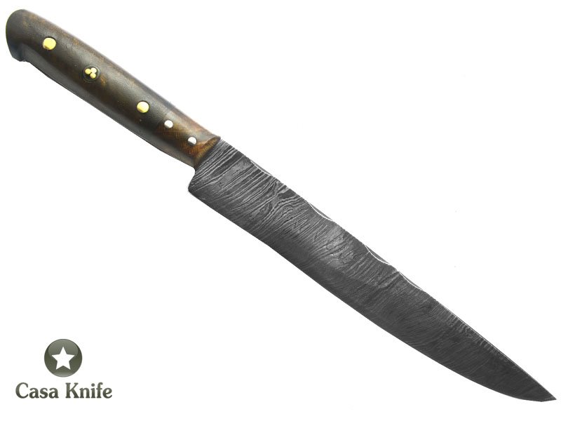 Monte Cristo Faca para churrasco para colecionador forjada em aço damasco, com empunhadura em Rádica de Roseira e Madeira estabilizada, 30 cm